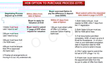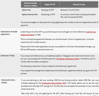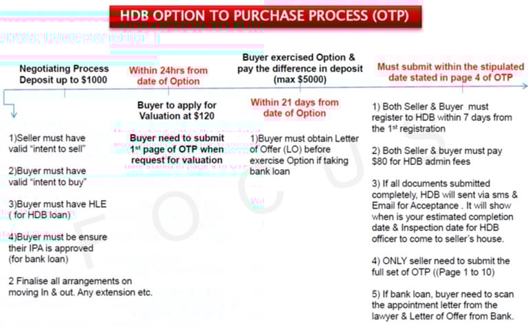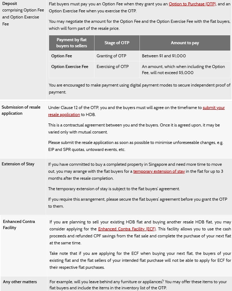 You must have a valid Intent to Sell for at least 7 days before you may grant an Option to Purchase to flat buyers. Start your journey by registering an Intent to Sell via the HDB My Flat Dashboard. After registration, you will be informed of when you may start to grant an Option to Purchase (OTP) to potential flat buyers. You will also receive information about the Ethnic Integration Policy (EIP) and Singapore Permanent Resident (SPR) Quota for your block, status of upgrading, billing of upgrading costs, and recent transacted prices of nearby flats.